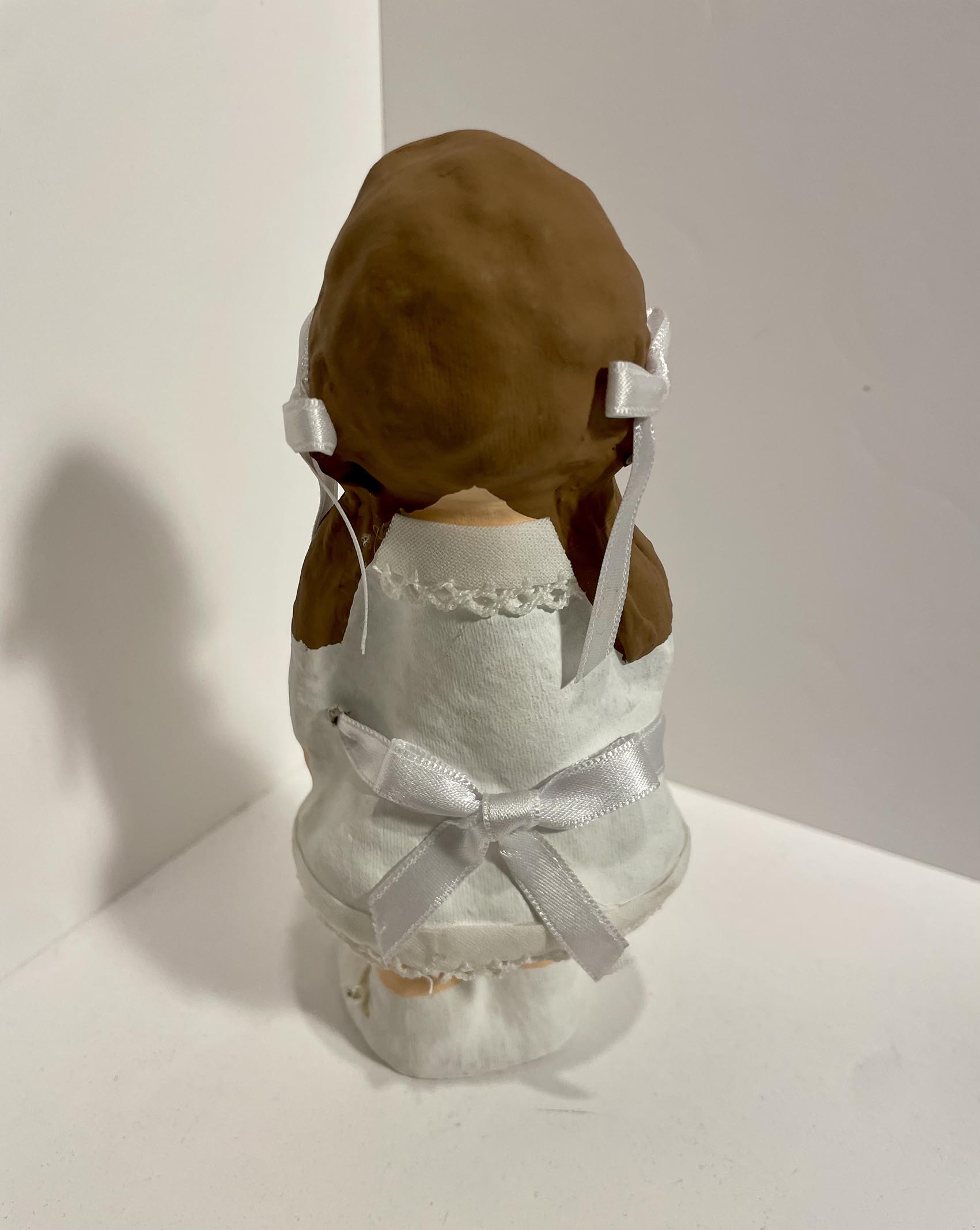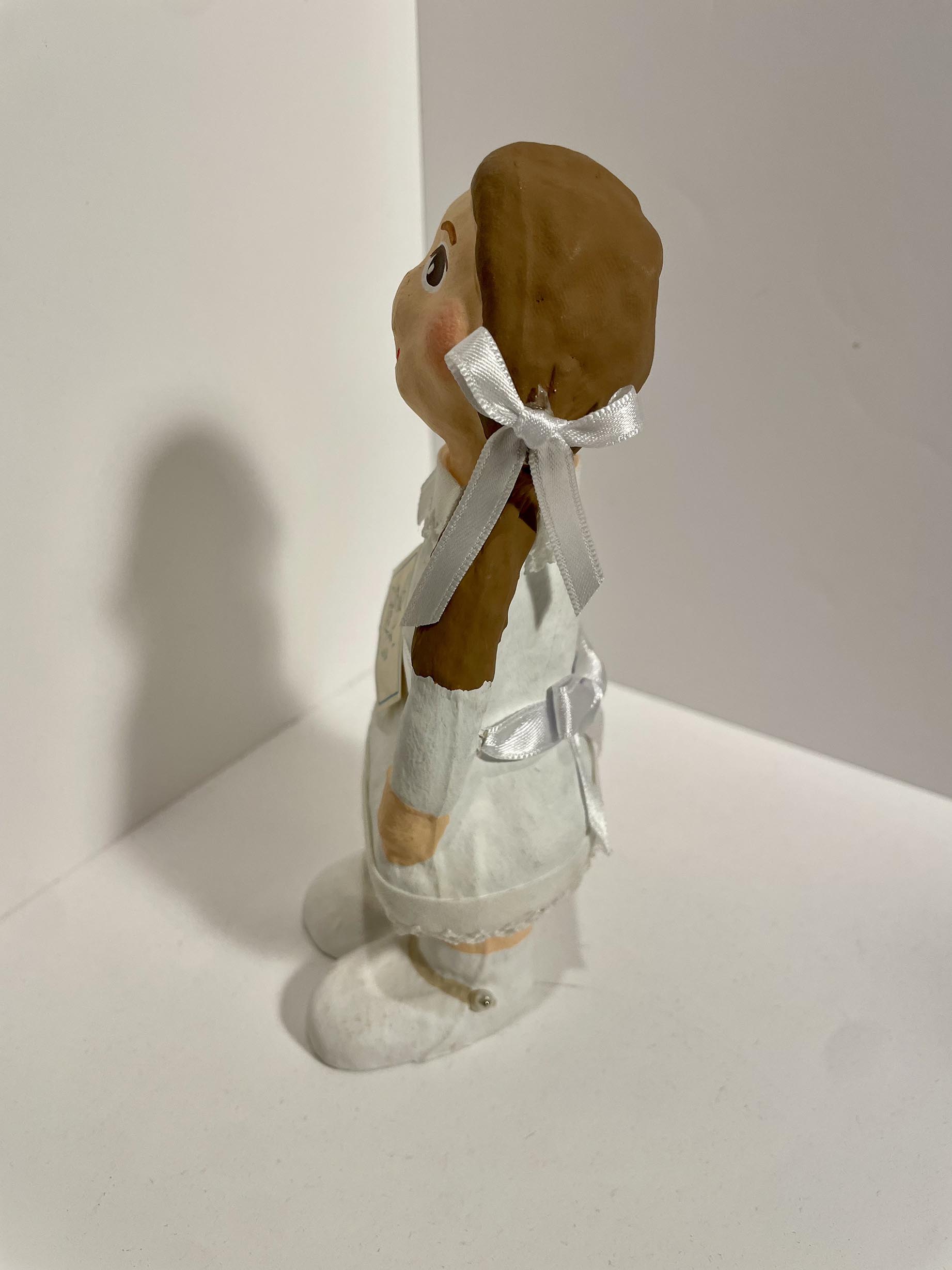 Aquesta figura de nena de comunió, feta amb la tècnica del paper maixé, és un record atemporal i commovedor que captura l’essència d’aquest dia tan significatiu. El seu encant i els detalls artesanals la converteixen en un obsequi preuat o un adorn especial que perdurarà en el temps, destacant pel seu caràcter fet a mà.