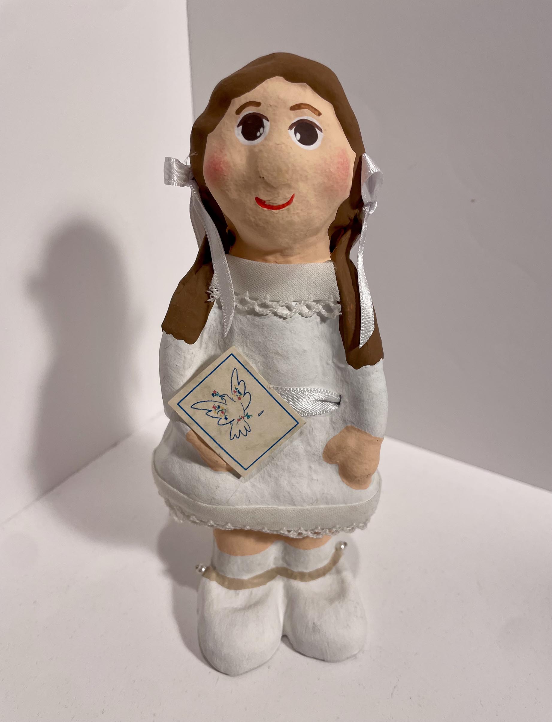 Una delicada figura decorativa, elaborada artesanalment amb paper maixé, que representa una nena vestida per la seva Primera Comunió. Amb un disseny clàssic i tendre, aquesta nina és un record perfecte per celebrar aquest dia tan especial, ideal com a obsequi o com a part de la decoració d’un esdeveniment.